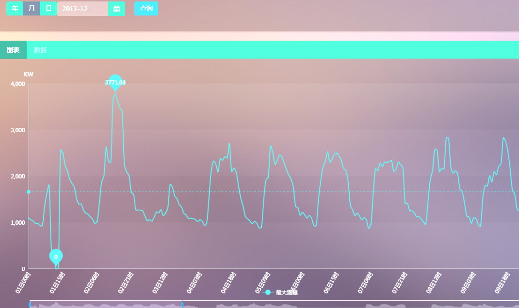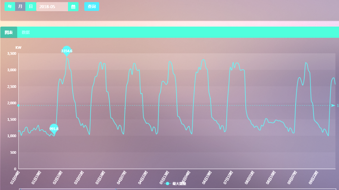 根据对该企业监测负荷曲线一段时间后,,发现该企业每月固定的一两次尖峰值是由大功率设备开启造成,,,因此,,,对该企业大功率设备的开启时间进行调整,,尖峰负荷下降400KW,,,对最大需量值进行调整,,,,每月节省基本电费12800元。。